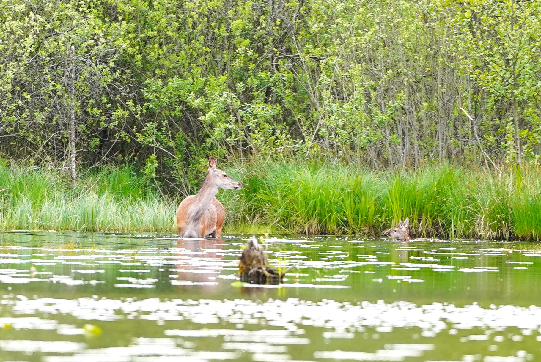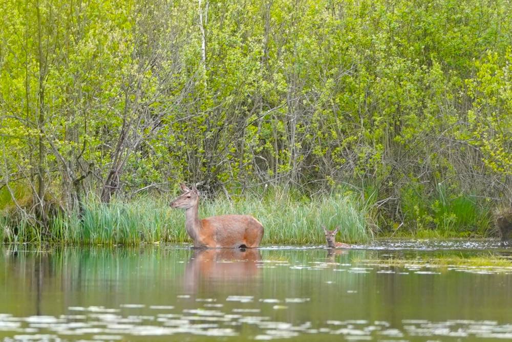 Matka, najprawdopodobniej uciekając przed zagrożeniem, zdecydowała się na ryzykowną przeprawę wodą. Miałem okazję po raz pierwszy zobaczyć jak młodziutki jeleń doskonale radzi sobie z pływaniem. Łania niezbyt zważała na głębokość, instynktownie wiedząc, że wspólnie dotrą do brzegu, gdzie niebezpieczeństwo zniknie. Po kilkudziesięciu metrach brodzenia, bohaterska dwójka cało i zdrowo dotarła na brzeg znajdując schronienie w wysokich szuwarach.
