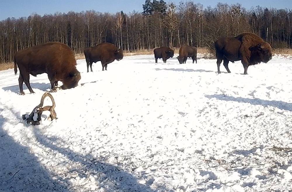Białowieskie polany przyciągają teraz mieszkańców puszczy. Dokarmianie zwierząt w tak trudnych zimowych warunkach ponownie staje się niezwykle istotną praktyką. Przy wypełnionych sianem brogach spotykają się całe stada - nie tylko samice z młodymi, ale również mniejsze grupy samców, a nawet najbardziej samodzielne, potężne byki.