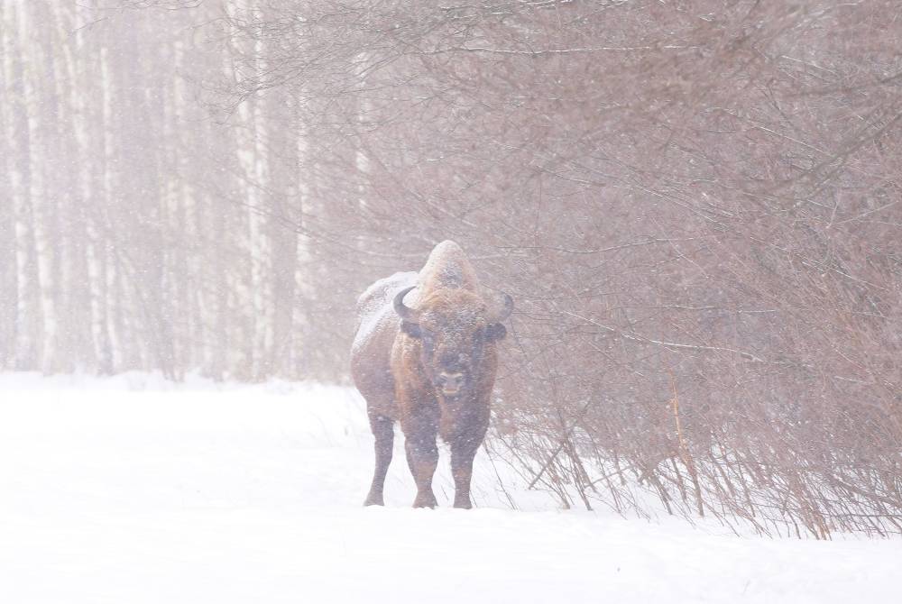 Mieszkańcy puszczańskiej wsi mieli dziś wyjątkowego gościa - potężny samiec spacerował środkiem drogi, z zaciekawieniem przyglądając się ludziom. Obecność żubra wśród zabudowań nie jest niczym nadzwyczajnym. Takie sytuacje zdarzają się zwłaszcza zimą, gdy dzikie zwierzęta szukają łatwo dostępnego pożywienia. Zaglądają więc do nieogrodzonych ogródków, penetrują sady i młode nasadzenia.