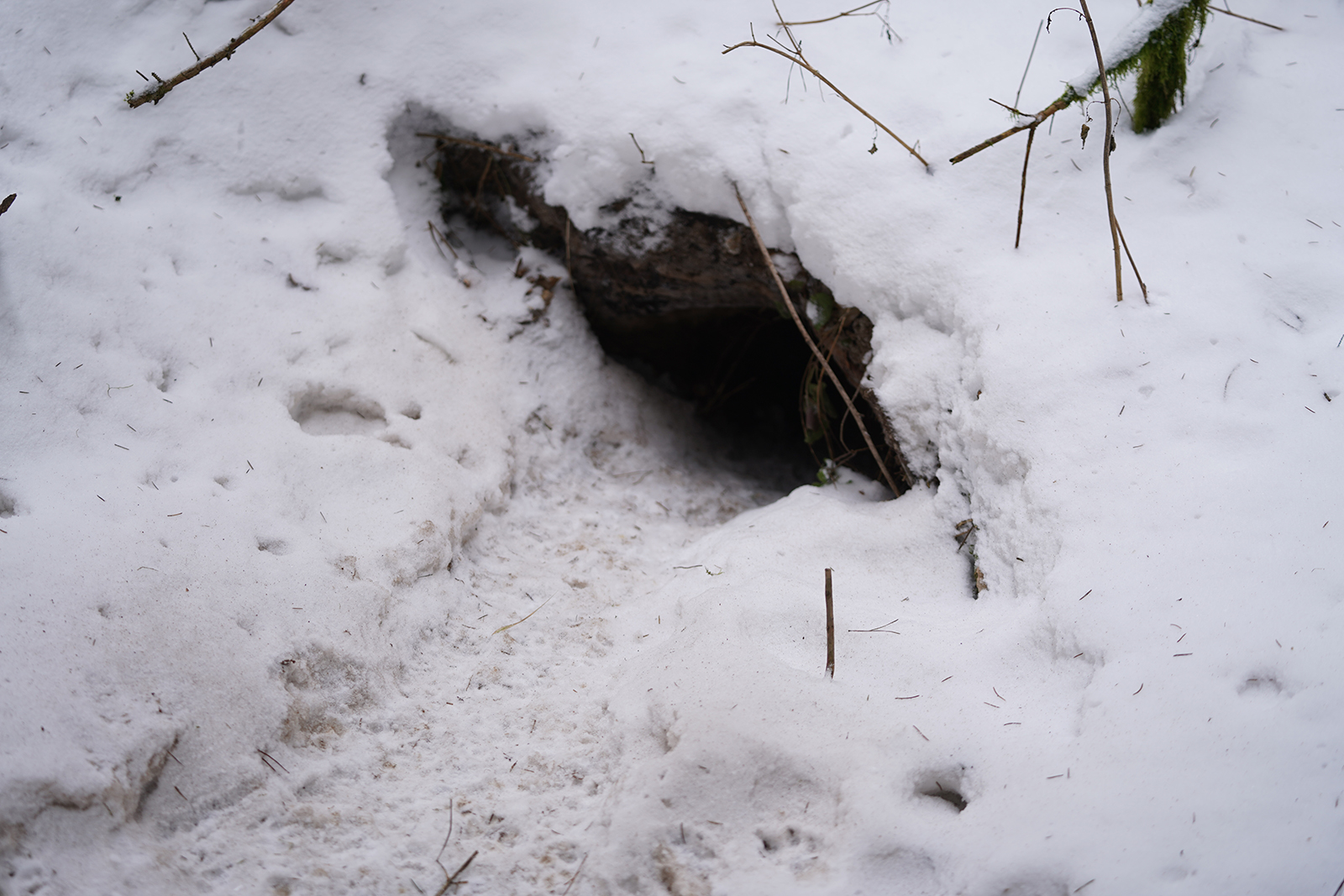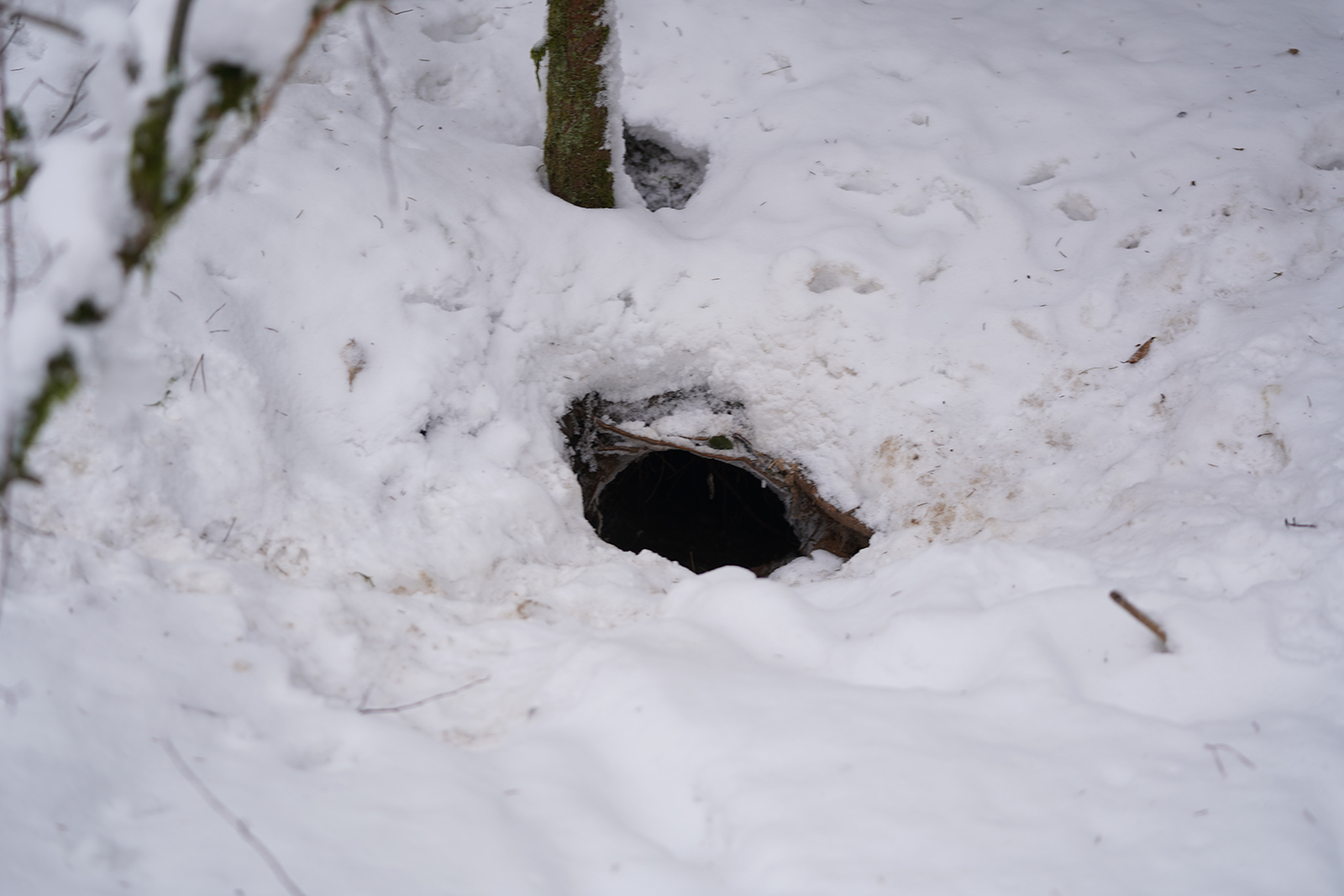 Sprytny lis wykorzystał jedną z gotowych jam jako schronienie przed niekorzystnymi warunkami pogodowymi. Oprócz lisich tropów widoczne były również ślady pozostawione przez gospodarza. Często zdarza się, że te dwa gatunki dzielą teren i żyją bezkonfliktowo tuż obok siebie.