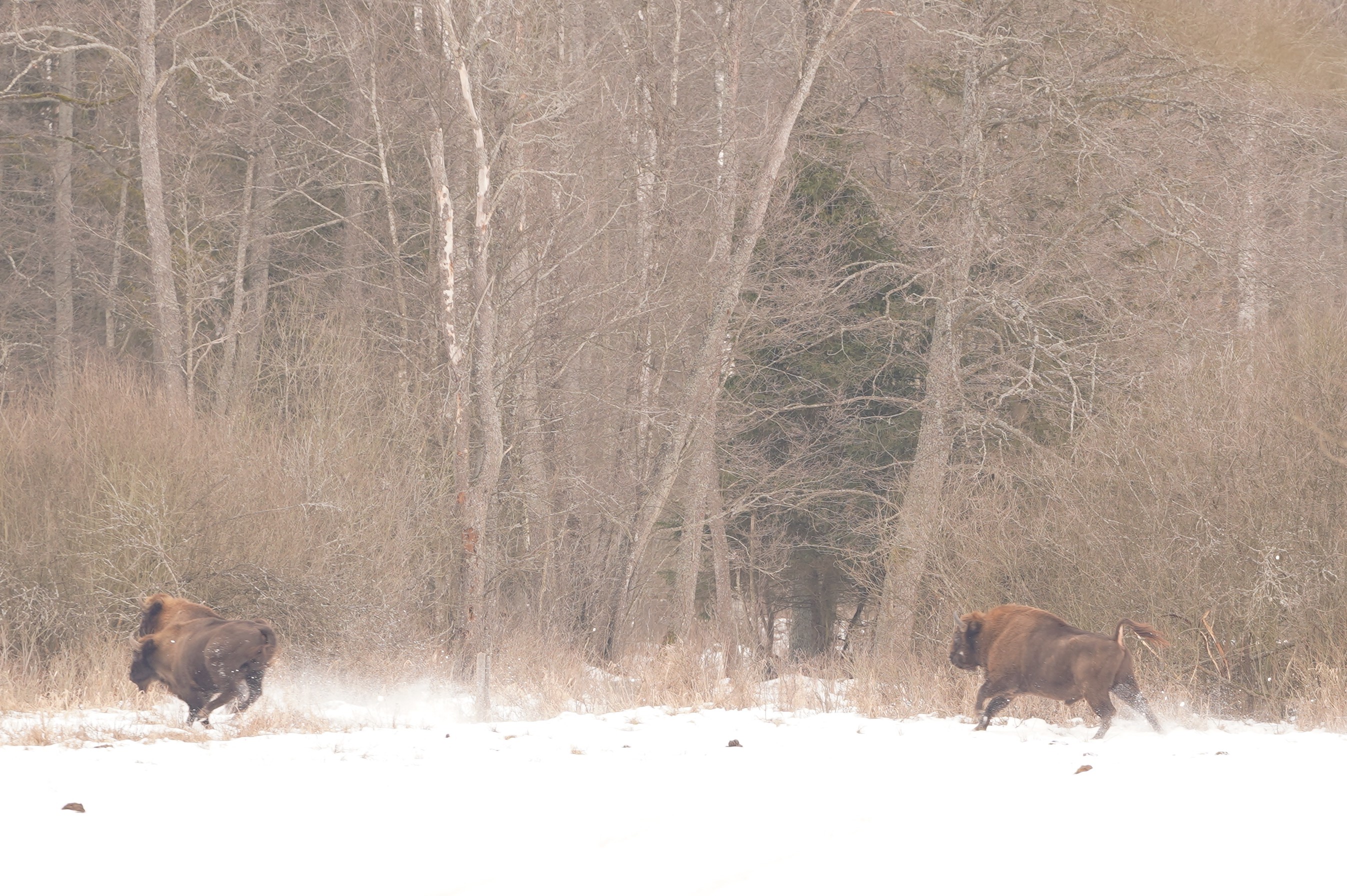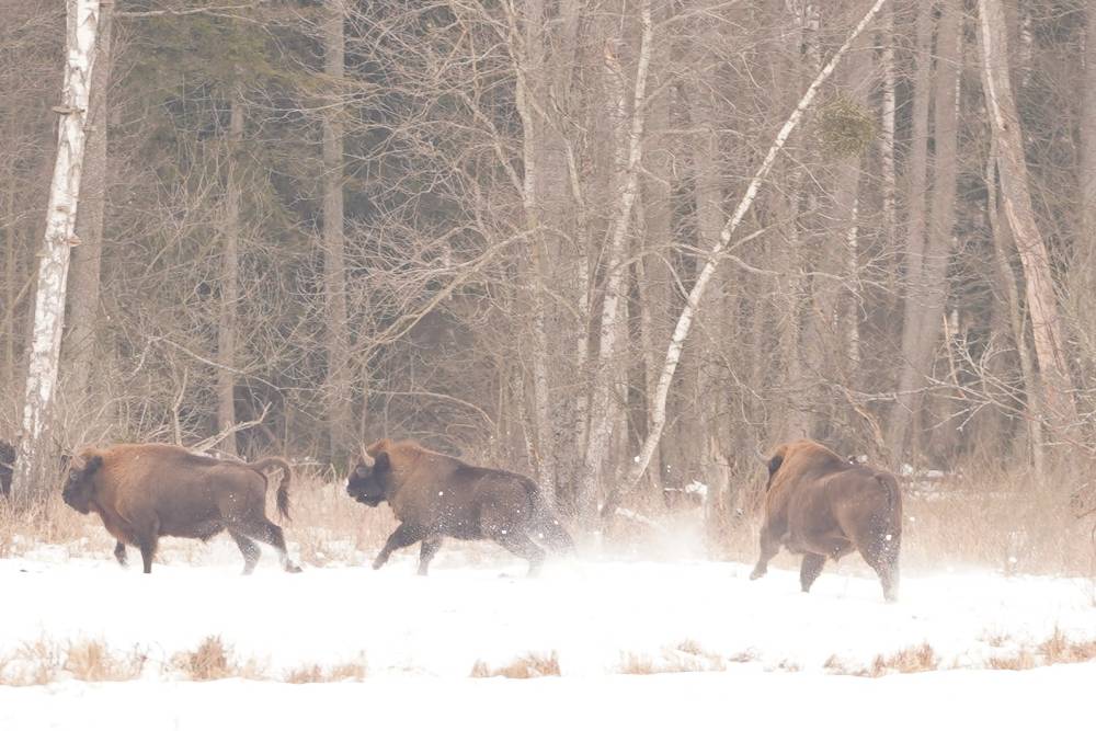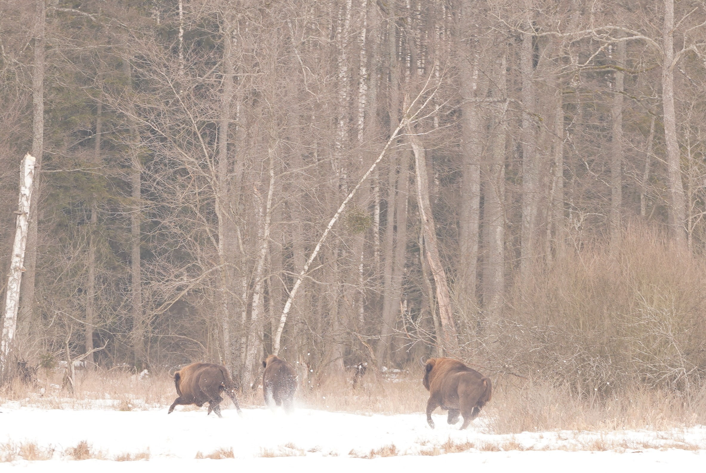 Dorosłe żubry w stadzie bez problemu poradzą sobie z drapieżnikami, a nawet obronią młode cielęta. A jednak, z trudnymi warunkami atmosferycznymi w puszczy radzą sobie tylko najsilniejsi. Trzy potężne samce bez zastanowienia zerwały się do ucieczki. Biegnąc tak po zmarzniętym śniegu nie sprawiały wrażenia ociężałych, wręcz przeciwnie - widać było ich siłę i potęgę. To właśnie im udaje się tu przetrwać i za każdym razem zachwycają mnie swoją siłą i zwinnością.