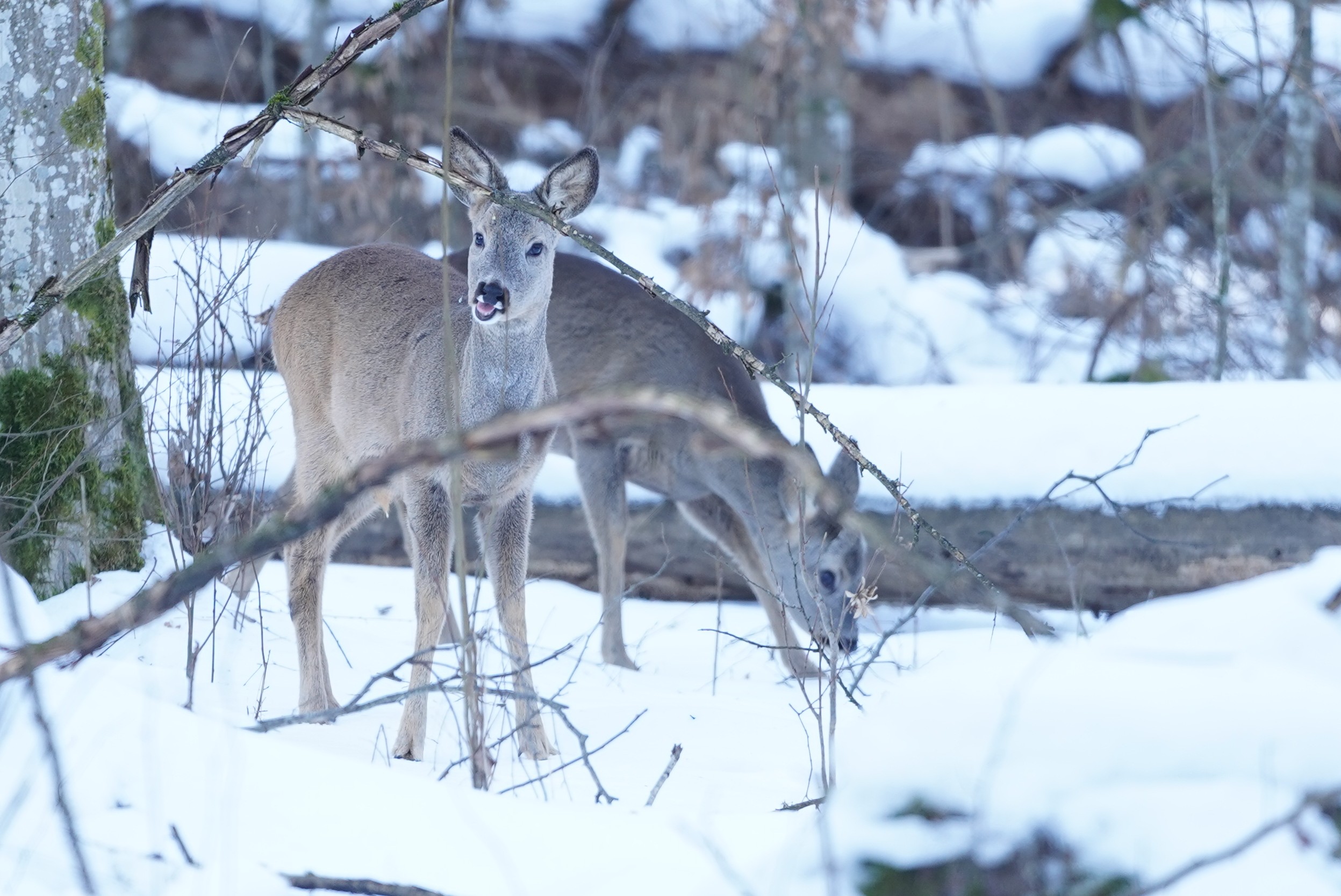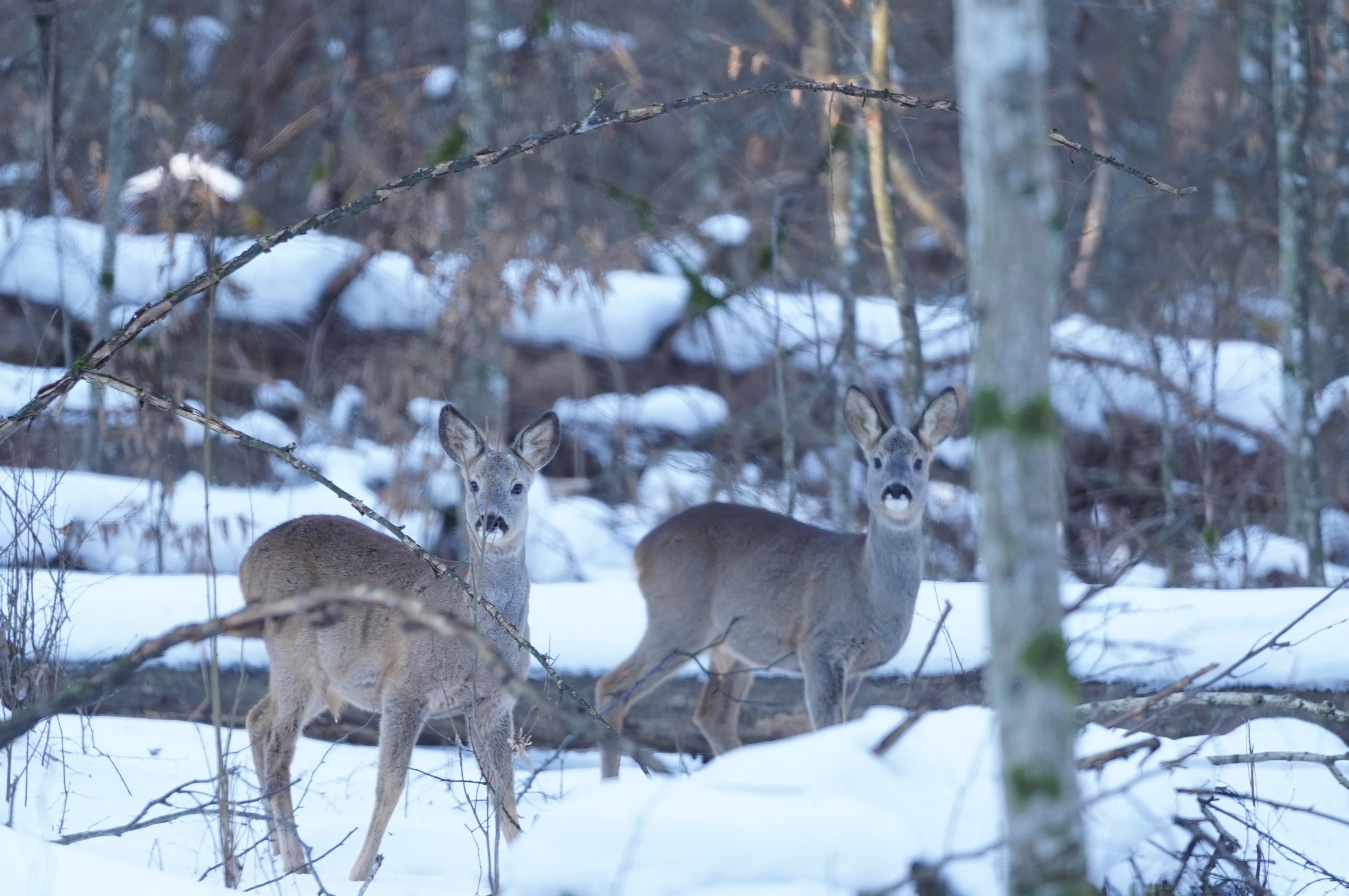 Po chwili dostrzegłem, że towarzyszą jej dwa młode rogacze. Gdy podjechałem o kilkanaście metrów, zaciekawione koźlęta spoglądały w moim kierunku, podgryzając przy okazji pędy młodych drzew. Matka, coraz bardziej zaniepokojona, czekała na potomstwo, które wciąż nie myślało o ucieczce. Gdybym szedł, z pewnością natychmiast dałyby susa do lasu. Samochód nie budził w nich aż tak silnego lęku, widocznie był czymś nowym, a przynajmniej rzadziej spotykanym, więc przyglądały się uważnie.