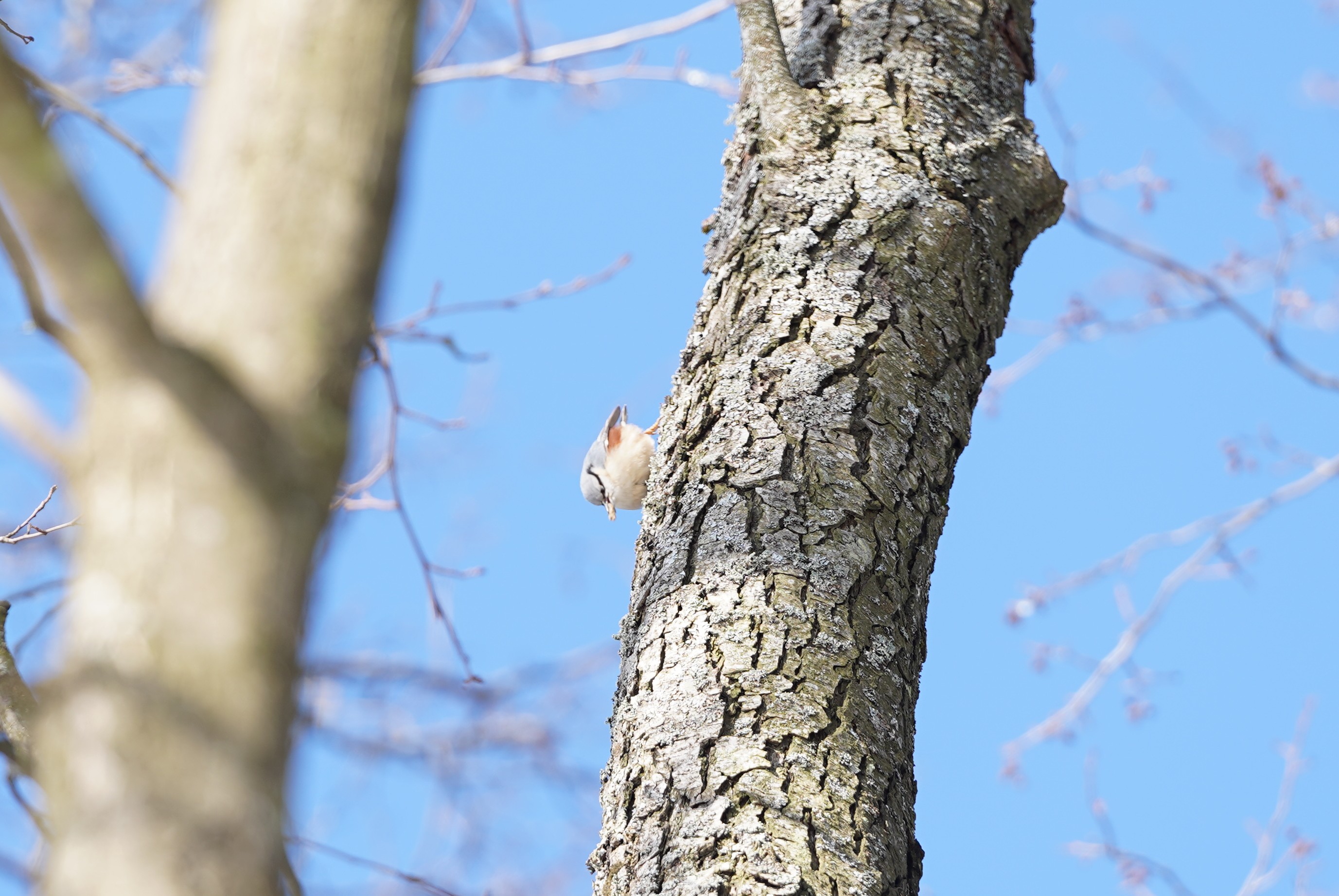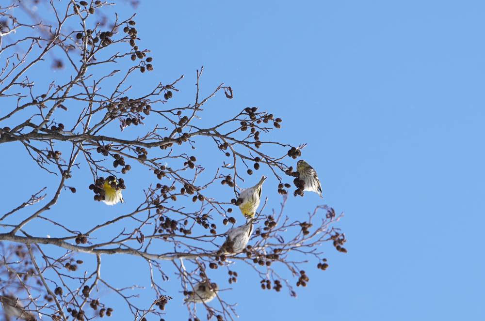 W tym samym czasie kowalik wędrował głową w dół, szukając poczwarek w spękaniach pnia olszy. Jedną udało mu się odnaleźć - widać to na zdjęciu, jak trzyma ją w swoim szpiczastym dziobie. Nieopodal grupa czyżyków łapczywie zajadała się nasionami olszy. Gdy podrywały się do lotu, rozlegał się charakterystyczny szum. Można się wtedy nieźle wystraszyć, zwłaszcza jak duże stado zerwie się nagle do lotu.