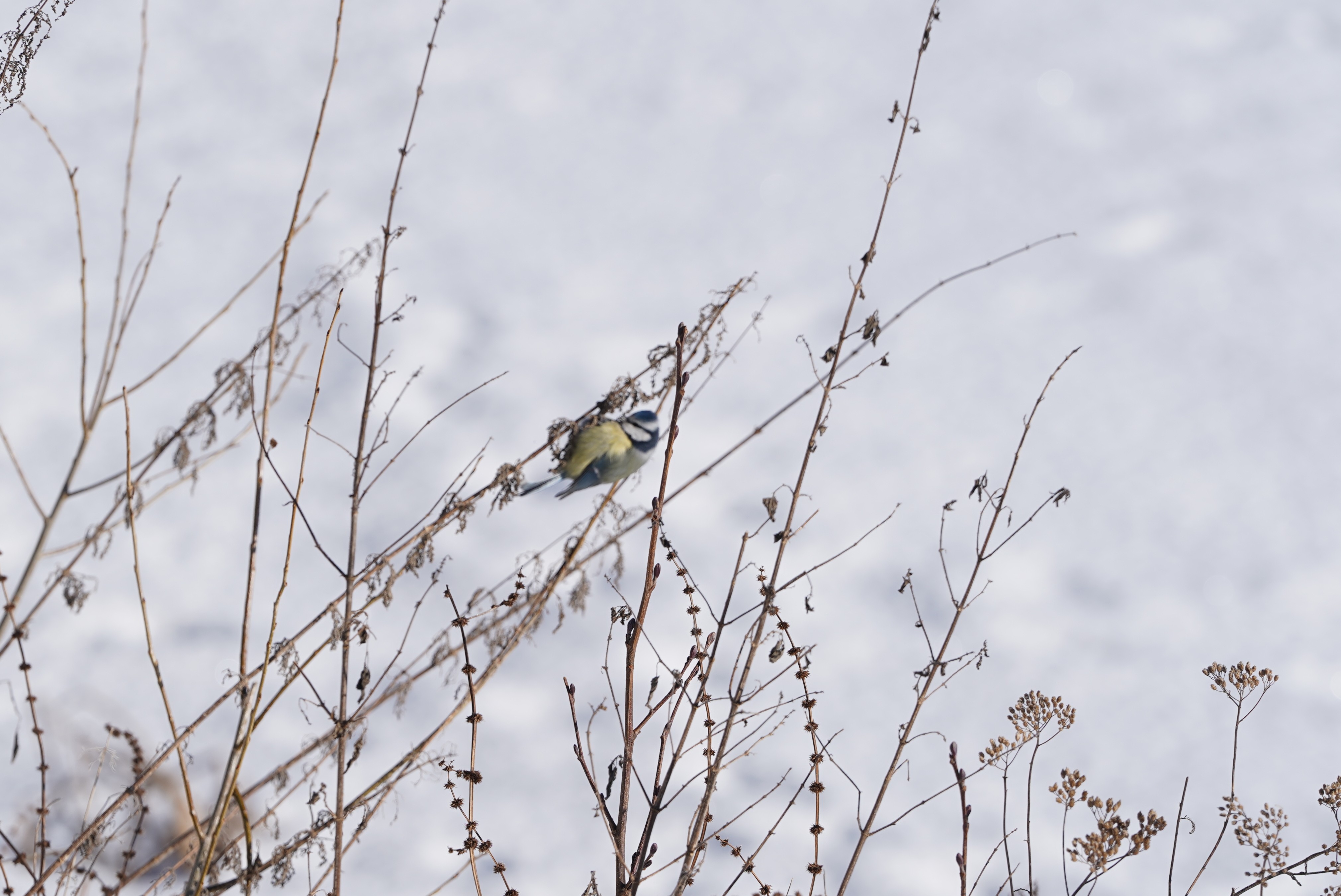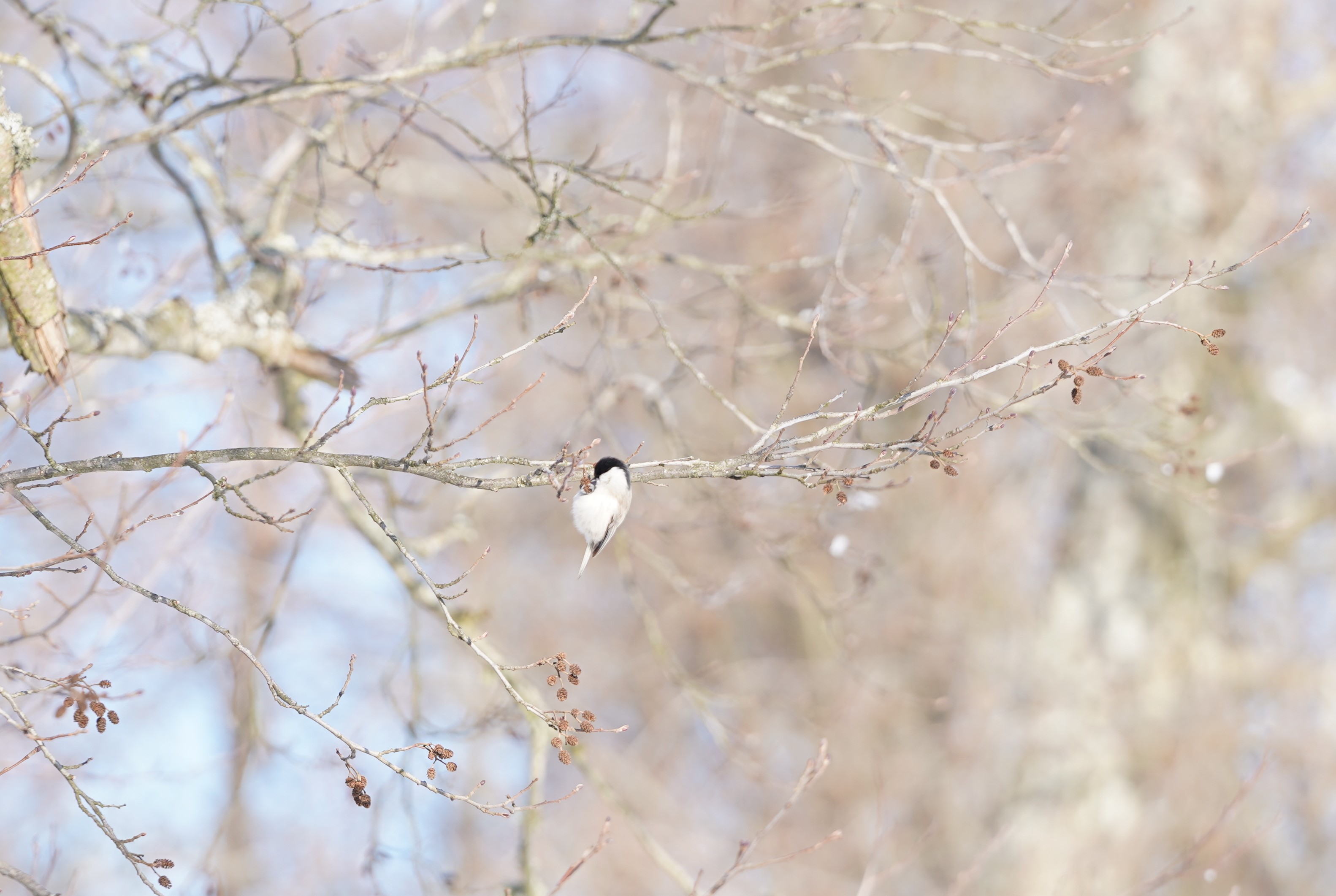 Pierwsze dostrzegłem sikory - ubogą, która wybierała nasiona z nibyszyszek olszy, oraz modraszkę korzystającą z nasion pokrzywy. Pędy roślin wychylały się pod jej ciężarem, lecz ptak nie odpuszczał i wytrwale wyskubywał drobne kuleczki.